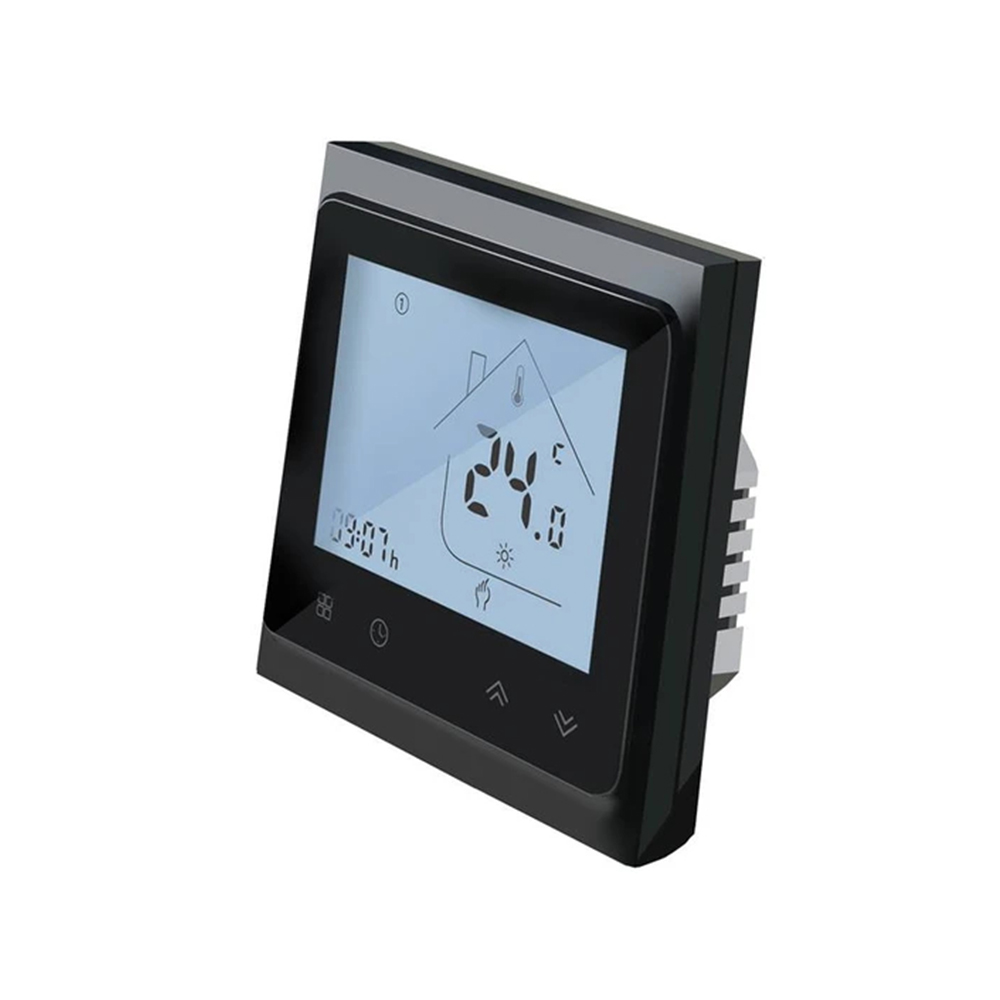 LCD-ekraaniga termostaat must 230V, 16A, IP20. Puutetundlik, nädala programm, põrandaanduri valmidus, süvistatav 68mm toosi. Sisseehitatud Wi-Fi moodul võimaldab ilma lisaseadmeteta siduda termostaadi nutirakendusega ning juhtida seda ka distantsilt nutitelefoni või tahvelarvuti abil. Sobib NC ajamitele.