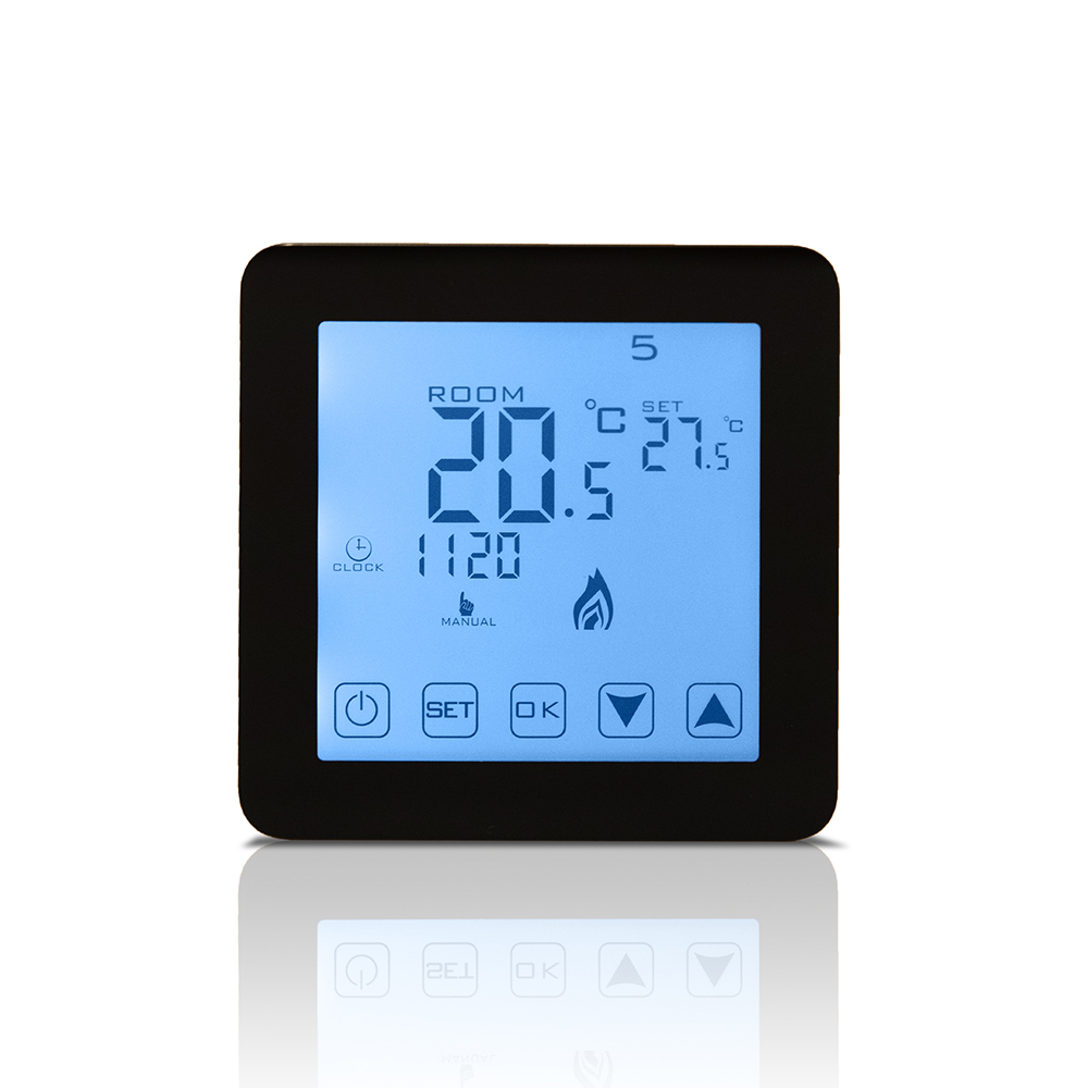LCD-ekraaniga termostaat must 24V, 16A, IP20 Puutetundlik, valge taustvalgustus, nädala programm, katlakivi eemaldamise funktsioon, põrandaanduri valmidus, süvistatav 68mm toosi