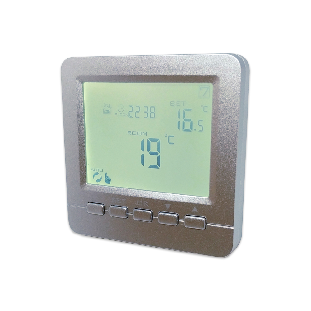 LCD-ekraaniga nuppudega termostaat hõbedane 230V, 16A, IP20. Ekraanil valge taustvalgustus, nädala programm, katlakivi eemaldamise funktsioon, põrandaanduri valmidus, süvistatav 68mm toosi. Sobib NC ajamitele.