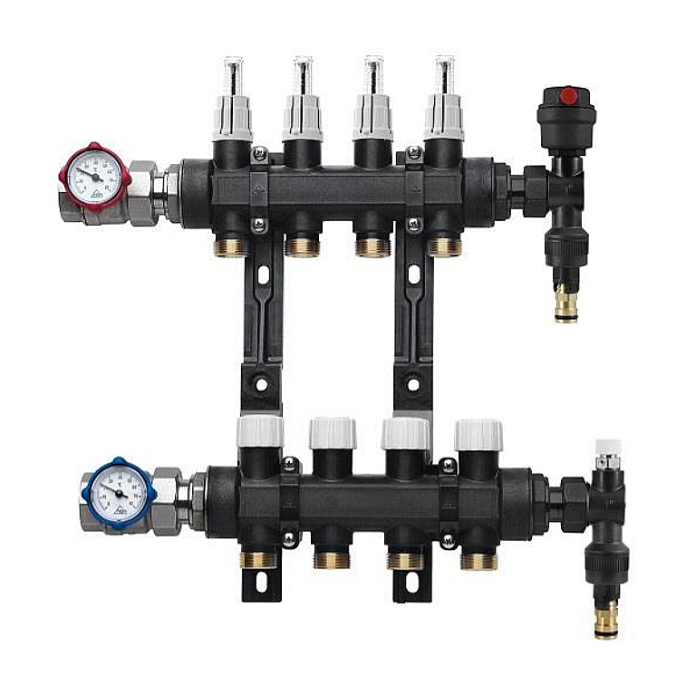 Täiskomplektsed 1″ komposiitmaterjalist kollektorid, vooluhulganäidikutega seadeventiilid, õhutusventiilid ja kiirtäiteotsad, integreeritud termomeetritega kuulventiilid, väljavõtted 3/4″ eurokoonus liitmikele, kahe suuna nihkega kollektori hoidjad.