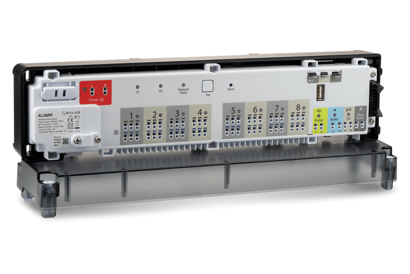 Juhtmekeskus töötab juhtmeta ühenduses SALUS Smart Home sarja termostaatidega. Sellel on sisseehitatud pumba ja katla juhtimisväljundid – töötab NC või NO ajamitega. Ühte ZigBee võrku (võrguühendusega või võrguühenduseta) saate ühendada 9 KL08RF juhtmestikukeskust.